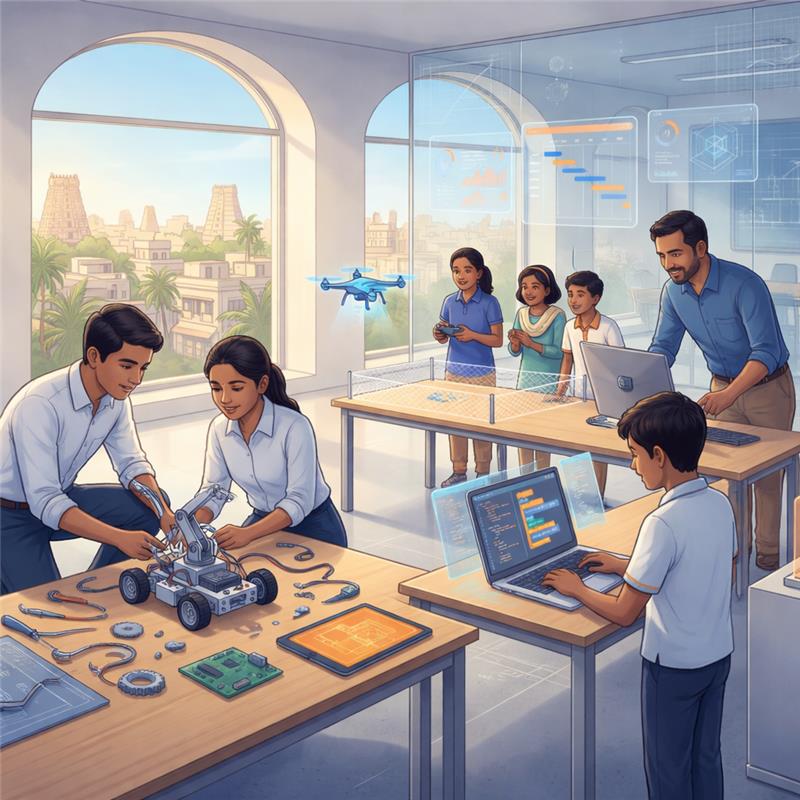 Learn Robotics, AI, Drone Technology, 3D Printing and Coding in just 15 Days through a high-energy, project-based program designed for ambitious students across Madurai and Tamil Nadu.